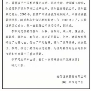 “在安信证券奋斗十五载,李军讲政治、顾大局、懂业务、善管理、敢担当、有作为,为公司的筹备、创立、建设和发展倾注了大量心血……”安信证券在讣告中表示。