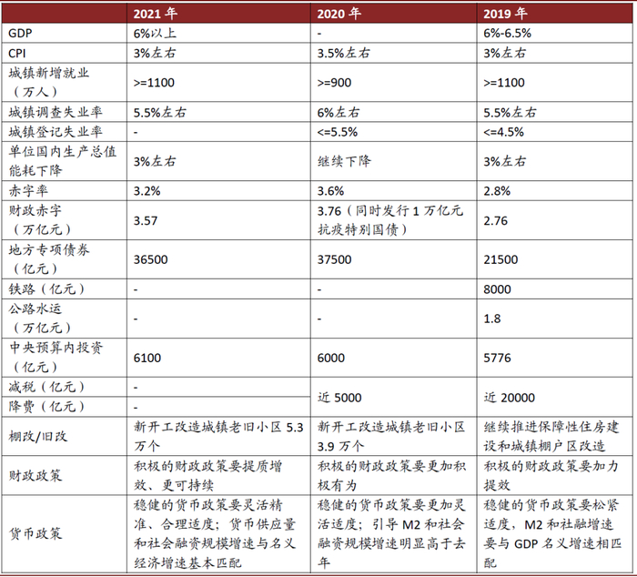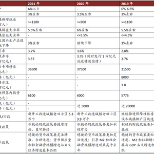三是财政政策仍保持积极态度,退坡力度低于市场预期。1)今年一般预算赤字3.57万亿元(赤字率由上年的3.6%降至3.2%),新增专项债额度3.65万亿元(仅略低于上年的3.75万亿元),广义赤字率6.5%,高于我们年度报告预期的6.3%。叠加今年财政收入恢复性增长,及去年未使用完毕的资金结转至今年,我们预计财政支出有望得到支撑。2)报告指出财政支出重点仍是基层“三保”(保民生、保工资、保运转),并继续压缩中央本级支出,建立常态化财政资金直达机制并扩大范围,今年有2.8万亿元中央财政资金纳入直达机制,规模大于去年的2万亿元。3)专项债支出方向上看,报告指出,新增专项债将优先支持在建工程,并合理扩大使用范围,继续推进“两新一重”建设,政府投资更多向民生项目倾斜,其中新开工改造老旧小区由去年的3.9万个提高至5.3万个。去年基建增速不及预期,部分与投资项目审批流程有关,报告指出今年将“简化投资审批程序,推进实施企业投资项目承诺制”,今年项目审批进度对基建投资的制约将会降低。4)减税降费今年未提具体目标(去年目标2.5万亿元,其中减税近5000万元,实际2.6万亿元,其中减免社保1.7万亿元),去年的一些阶段性、特殊性政策将逐步退出,但制度性减税效应仍会继续释放,结构型减税仍将继续(受疫情影响较重的服务业、小微企业减税降费政策适当延长)。