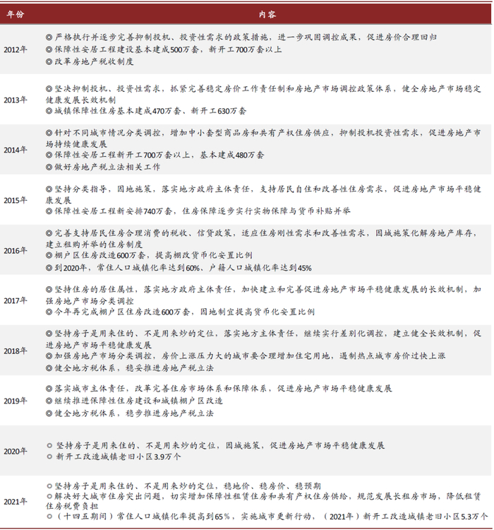 五是坚持房住不炒。疫情期间大量释放流动性后呈现K型复苏,投资性购房需求升温,同时租房市场对租户的保护力度较弱,报告继续强调稳地价、稳房价、稳预期,同时提出长效机制解决大城市住房突出问题,如增加土地供应、安排专项资金、集中建设、增加保障性租赁住房和共有产权住房供给,规范发展长租房市场,降低租赁住房税费负担等。