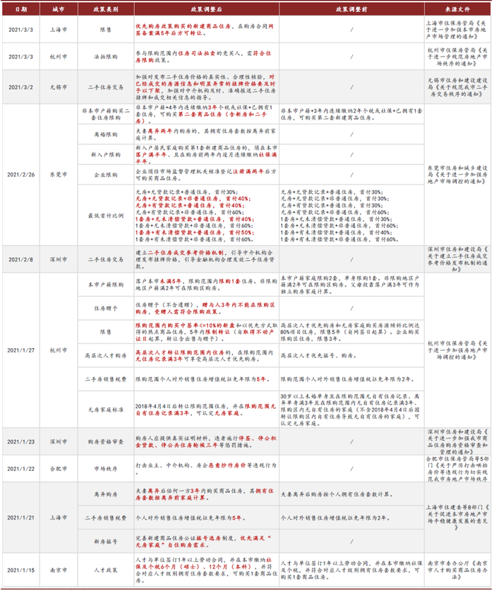 ► 我们认为需求端政策大概率仍将遵循“因城施策”框架。各地方政府针对投机性购房需求出台“打补丁”的楼市政策,精准调控以防范局部地区房价过快上涨风险蔓延(今年以来,房价涨幅较快的深圳、上海、杭州、合肥、东莞等地均已出台楼市调控新政)。