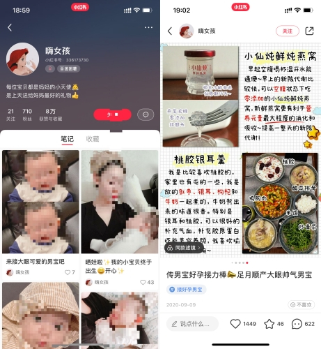 界面新闻记者浏览发现,在抖音上,不乏有相关视频的发布者同时从事母婴用品电商业务,或是某妇产医院的抖音号。在小红书平台上,已经有个别博主专门发布“接男宝”的内容,以获得点赞、收藏、留言,最终集聚人气。