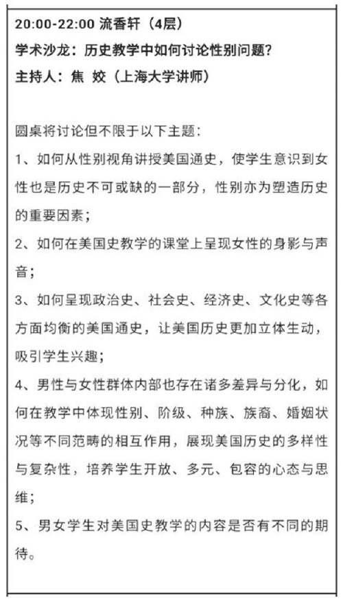 在中国美国史研究会(AHRAC)第18届年会整齐而紧凑的日程中,“女性历史学者沙龙”的组织形式似乎有些“不伦不类”,又容易引发误解:首先,虽然名称叫“女性历史学者沙龙”,但参与者的性别不限于女性,而是向所有与会者开放。其次,虽然关注性别议题,但沙龙不是一个性别史研究的学术讨论会,也不要求参与者提交相关主题的论文。其三,沙龙不占用会议的正式讨论时段,而是放在晚宴后的“休闲时间”。其四,除了事先给出的几个引导问题外,沙龙不设固定的程式和发言顺序,完全采取开放式讨论。