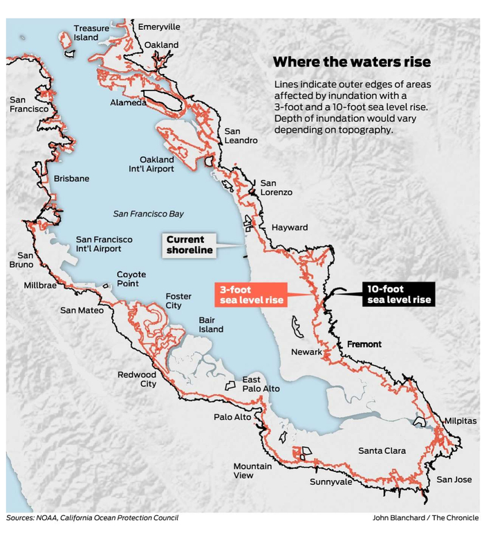 在城市蔓延的重压之下,湾区大部分地区都在下坠。与此同时,海面还在持续上升。未来几十年里,湾区城市如何保全?