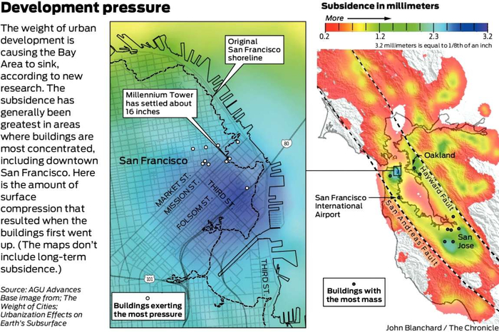 美国地质调查局地球物理专家汤姆·帕森斯(Tom Parsons)就此问题开展了研究。他计算了湾区每栋建筑的重量,发现总重量如此之大,约16亿吨,相当于700万架波音747的重量。他的研究表明,经历一个世纪的开发后,湾区地面平均下沉了约7.9厘米。其中,高达197米的千禧塔,10年沉降了约40多厘米,且沉陷并不均衡,导致大楼成为“斜塔”。