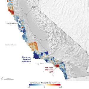 美国加州海岸带地表沉降与隆起分布图,蓝色为沉降区,红色为隆起区,颜色越深表示变化越剧烈。图片来源:https://earthobservatory.nasa.gov/images/147439/californias-rising-and-sinking-coast?src=ve