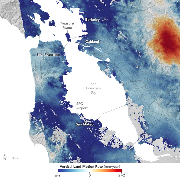 美国旧金山地表沉降与隆起分布图,蓝色为沉降区,红色为隆起区,颜色越深表示变化越剧烈。图片来源:https://earthobservatory.nasa.gov/images/147439/californias-rising-and-sinking-coast?src=ve