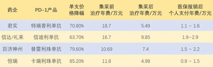 此前售价高达十余万的PD-1产品,医保报销后,价格最低的卡瑞利珠单抗,患者个人一年仅需支付0.9万至1.5万。
