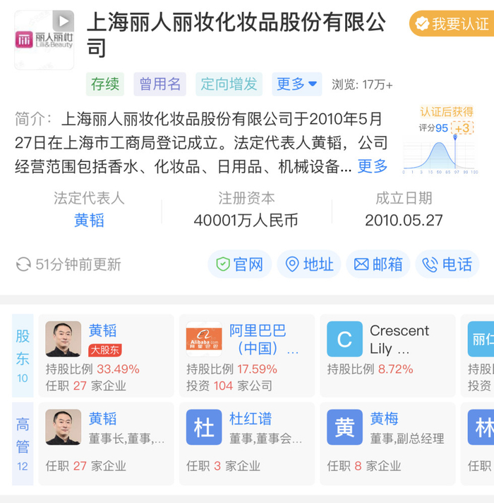 据天眼查,丽人丽妆运营主体上海丽人丽妆化妆品股份有限公司成立于2010年,黄韬为大股东,持股33.49%;二股东则为阿里巴巴(中国)网络技术有限公司,持股比例17.59%。而翁淑华未持有公司股份并且未在公司任职。