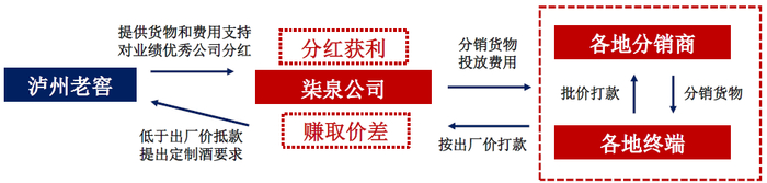 2009年,老窖进一步推出柒泉模式。该模式其实是经销商持股模式的延伸,即由原来的销售团队、经销商共同出资建立柒泉公司,然后老窖将中高端产品的终端销售外包给柒泉公司,由柒泉公司向各地分销商和终端进行销售。因此,产品的中间差价和来自泸州老窖的分红构成了柒泉公司的主要营收来源。