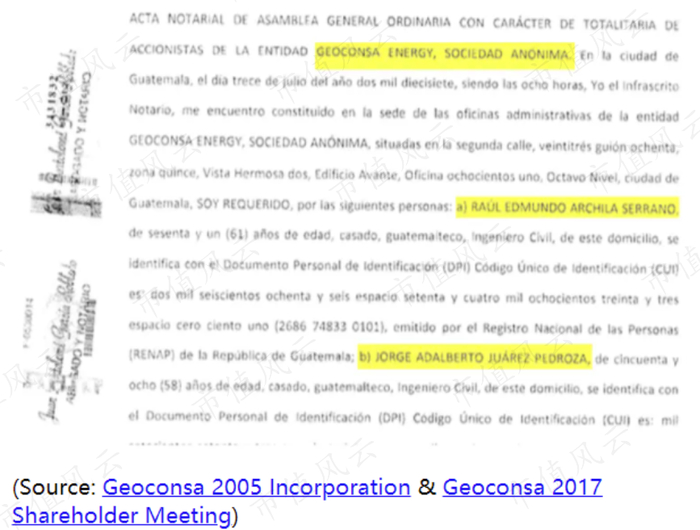 而根据商业登记处的记录,Geoconsa Energy是由前矿业和能源部长Raul Edmundo Archila Serrano(2000-2004)和INDE的前总经理Jorge Juarez Pedroza(2002-2004)经营的。