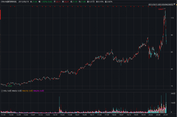 奥玛特科技是一家美国的上市公司,主要从事地热和回收能源电力业务,在过去的十年里,奥玛特的股价一路上涨处处透露着牛股气息,并且从2020年9月开始,凭借美股炒作能源股的东风,公司股价直接翻倍。