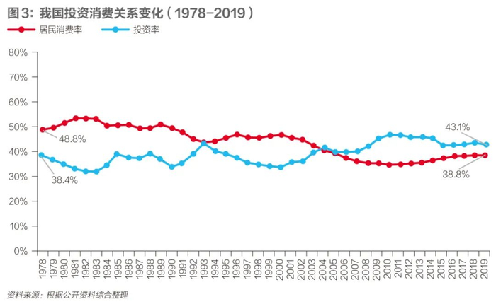 值得注意的是,扩投资必定引发中国内需结构的调整变化。北京大学光华管理学院展示的一份统计数据显示,中国的投资率从1978年的38.4%上涨至2019年的43.1%,消费率则从1978年的61.9%下降至2019年的55.4%——这意味着上述两项数据约为世界平均水平的两倍和三分之二。而国民经济研究所副所长王小鲁在内的诸多经济学家已针对中国投资率长期偏高、消费率长期偏低作出过警示: