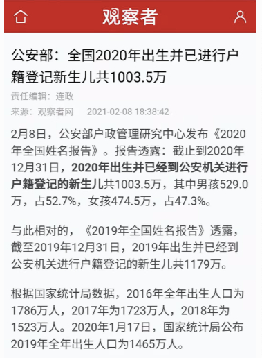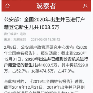 2021年初,关于2020年中国新生人口总数量成为了全网的热点,准确的新生人口到底是多少,各方争论不休,就连2020年的统计公报也一反常态,没有按照惯例公布新生人口。不过,2月8日公安部公布了2020年出生并已进行户籍登记的新生儿数量,总数是1003.5万。
