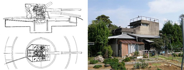 日军绘制的SKC/28炮图纸及角岛炮台现存的指挥碉堡(已被改建为住宅)