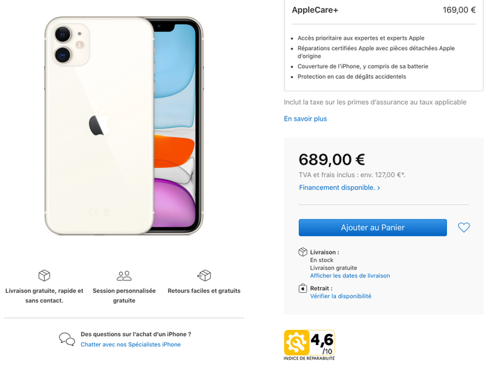 苹果法国官网中iPhone 11 的可维修评分