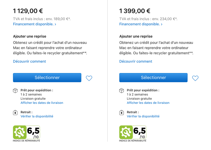 目前苹果法国官网,在 iPhone 、MacBook 等产品详情页中都加了一个“可维修分数”的标志,可维修分数一般是 10 分满分制,分数越高表示维修越容易。