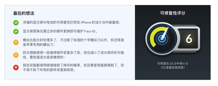 说到这,你可能会想起知名维修网站 iFixit 所推出的可维修分评价体系,实际上这两者确实有一定的相似,从结果上来看 iPhone 12 在 iFixit 和法国苹果官网获得可维修分数均是 6 分。