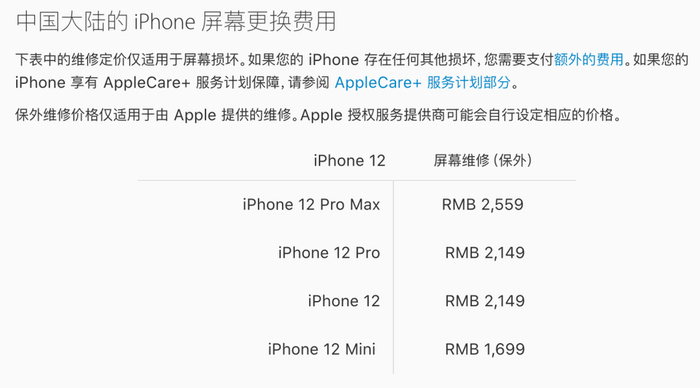 而之所以谈到维修权经常会将苹果作为案例展现,是因为它作为全球最大手机制造商之一,对电子产品维修的保留态度。首先就是官方维修价格高,以 iPhone 12 为例, 它的屏幕维修价格达到了 2149 元,几乎是产品价格的三分之一。
