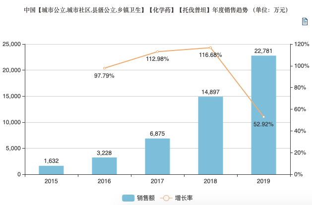 托伐普坦片属于利尿剂药物中的“重磅炸弹”,在该品类的几种药物中,托伐普坦片全球销售额在近年来取得了强劲增长。查询EvaluatePharma数据库,2020年托伐普坦片全球销售额约为15.77亿美元,据米内网数据库显示,近几年托伐普坦在国内的市场规模增长迅速,2019年达到22781万元,增长率为52.92%。