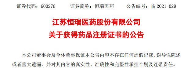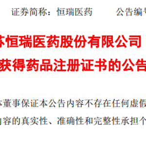 今日(3月9日)江苏恒瑞制药股份有限公司发布公告称,近日收到国家药品监督管理局核准签发的关于托伐普坦片的《药品注册证书》。