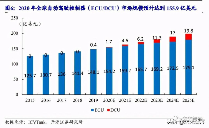 ◼ 自动驾驶域控制器:承担了自动驾驶所需要的数据处理运算及判断能力,包括 对毫米波雷达、摄像头、激光雷达、GPS、惯性导航等设备的数据处理工作。同 时,自动驾驶域控制器亦负责车辆在自动驾驶状态下底层核心数据、联网数据的 安全保障工作,是推动自动驾驶迈向 L3 及以上更高等级的核心部件。此外,由 于自动驾驶域控制器需要更强的 AI 算力以及算法的支持,因而参与研制的厂商 众多。除传统汽车产业链内的整车厂及供应商以外,还包括有英伟达、高通、地 平线、黑芝麻等海内外 AI 芯片龙头厂商,以及阿里、谷歌、QNX、华为等自动 驾驶操作系统供应商。目前来看,除特斯拉 Model3、小鹏 P7 等少数车型以外, 绝大多数已量产的自动驾驶域控制器尚未达到 L3 级自动驾驶级别。根据 ICVTank 数据统计,2020 年全球 ADAS 相关控制器市场规模将达到 155.9 亿美 元,其中大部分均为 L3 级以下辅助驾驶控制器(ECU),而预计到 2025 年全球 自动驾驶域控制器市场规模有望达到 19.8 亿美元。