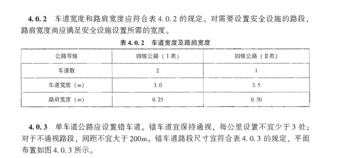 四级公路车道宽度和路肩宽度标准,明确规定了四级公路的车道宽度为单车道最低3.5米,双车道(每条)最低为3米。