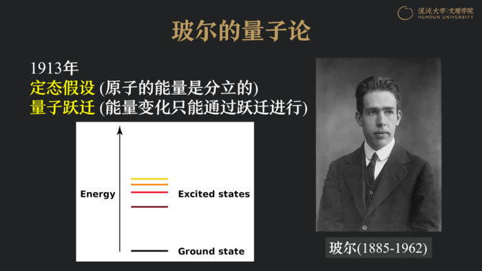 这是当时遇到的一系列问题,但是我们知道,很多粒子的稳定性非常高,它们的年龄比我们的宇宙年龄还要长。到了1913年,另一位颜值很高的物理学家玻尔,提出了两个理论概念,即定态假设和量子跃迁。