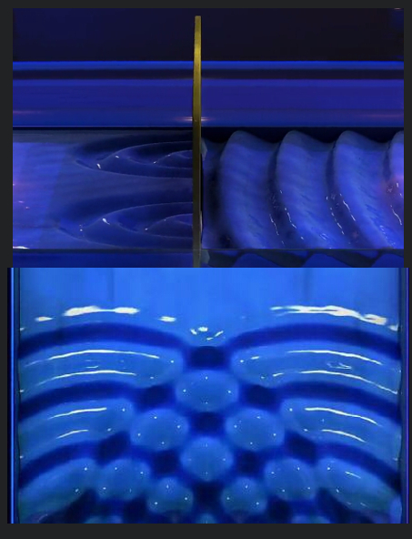 电子的波动性,可以理解成像水波一样,那么波是怎么来的?它其实是概率波。它能穿过缝,是因为它的动能,前面的波会挡住后面的波,当它穿过这两个缝会进行衍射,交叉又会形成干涉,于是有些波会叠加,有些波会相消,于是就变成了底下的图像,如同鱼鳞般的条纹。