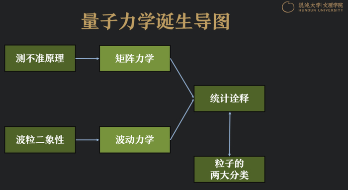 不管怎么样,到了30年代,思想告一段落,接下来就是如何在思想上去生长或者发展出一套理论,也就是量子力学的建立。量子力学的建立基本上来自于两条线,一条是测不准理论的发展,另一条是波粒二象性的发展。这两个腿走出来的是两个学说,即矩阵力学和波动力学,后来将这二者结合,统一用统计的方法诠释,也就是后来我们所说的哥本哈根学派的量子力学。量子力学的概念被统计诠释之后,它很快对整个物质世界的认知,进行了第一次的挑战,它将所有的粒子分成两大类,费米子和玻色子。