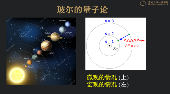 大家可以看下图,左边是太阳系的轨道结构,右边是原子核内部的轨道结构。微观与宏观的最大区别是什么?虽然说轨道似乎都是稳定的,但是我们仍然可以在宏观轨道上进行一些微调,例如发射卫星,如果发现卫星发射歪了,依旧可以微调。可是在微观世界里,电子围绕原子核运转,就必须固定,只能从能态到另外能态进行跃迁,然后同时释放的只有光子。这就解释了为什么黑体辐射的辐射能量是分立的,因为它是一份一份发射出去的,这就对玻尔的量子论进行了完整解释。