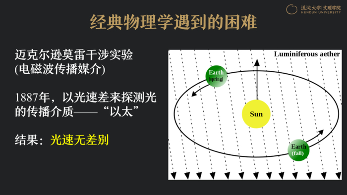 1887年之前,有人提出,可能有一种东西漫布在整个宇宙时空当中,我们将它叫做以太。以太是我们建立起来的宇宙的绝对坐标系,在绝对坐标系当中有常数叫光速。