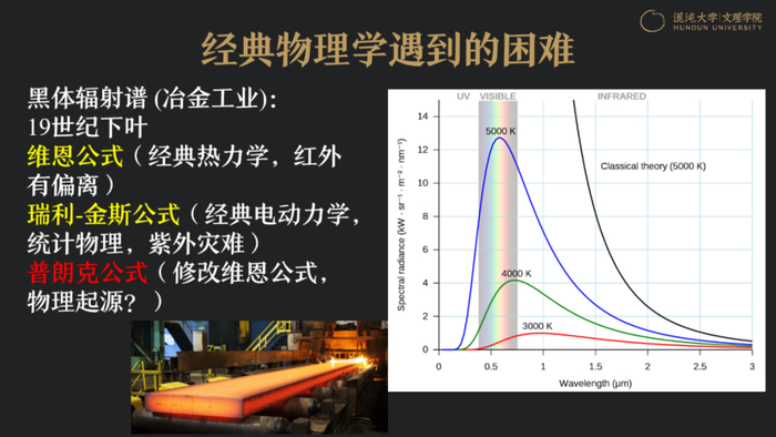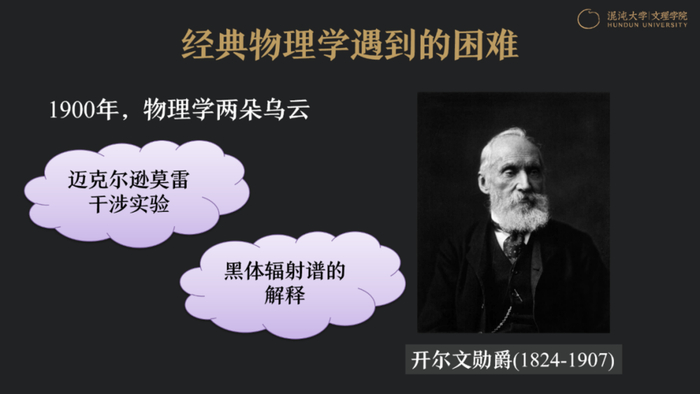1900年,苏格兰科学家开尔文在跨年物理学Party上,做了一个非常经典的演讲,致敬经典物理学大厦的建成。同时,他也说当时的经典物理学有两朵乌云,分别指的是迈克尔逊-莫雷实验和黑体辐射谱。当时,黑体辐射谱被发现之后,大家很难从理论上去解释。但开尔文说,这两个问题是两朵小小的乌云,如果进行更深入的研究,可以解决。
