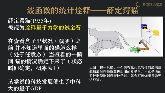 科技发展到今天,对于纠缠态的测量也有了新的发展。中科大有个很有趣的名词叫做量子GDP。现今量子科学技术的发展分别有三个方向,即量子光学、量子测量和量子通讯。量子GDP分别代指中科大这三个方向的三位院士:G是郭光灿院士,他进行量子光学;D是杜江峰院士,他进行量子测量;P是潘建伟院士,他做量子通讯。这一整套庞大量子体系的发展,最早就源自薛定谔在1935年对他所假想出来的一只猫进行的残酷实验。