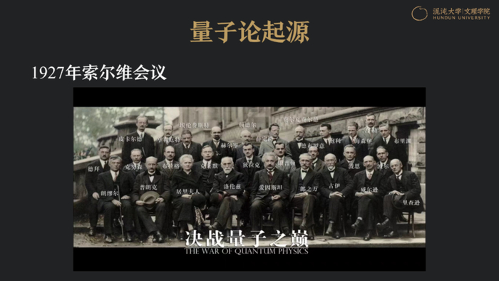 1927年,有个非常著名的索尔维会议,这张照片流传非常广泛,第一排是普朗克、居里夫人、洛伦兹、爱因斯坦、郎之万、古伊、威耳逊,还有理查森。第二排是玻尔、玻恩、康普顿、狄拉克,这些人应该说改变了整个人类科学的历史。因此,我将这张照片叫做决战量子之巅,实际上,会议本身是量子论初期发展的收官之战。