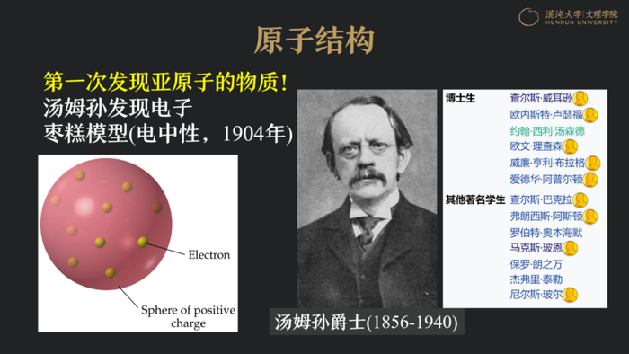 他所做的最重要的工作,就是穿过原子结构,进入亚原子的世界,首先发现了电子。我觉得他非常有趣,可能也跟我一样比较喜欢美食,所以有吃货本质,他发现电子的时候,想象出的原子结构是枣糕模型。他认为原子是圆球,上面铺着星星点点的电子,这就叫枣糕模型。