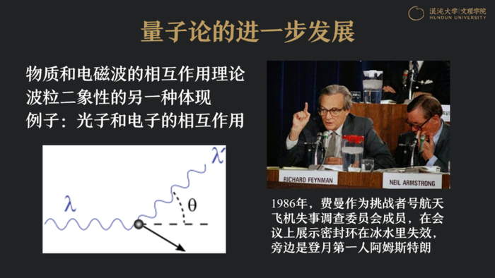 到了上世纪30年至50年代,量子力学逐渐建立起来后,开始深度发展的是量子场论,而量子场论的最具代表性的就是量子电动力学。这里面有三位科学家,朝永振一郎,一位日本科学家;费曼,非常帅;还有施温格。量子电动力学先将原有的麦克斯韦电磁理论量子化,它描述的是物质和电磁波和光之间发生的相互作用,它用另外一种方式体现波粒二象性,典型的就是费曼图,由费曼提出,比如光打到电子,一开始电子是静止的,光打过去之后,电子跑掉,光也发生散射,从另外方向逃逸,那么这就是光子和电子之间的相互作用,可以用图来描述。