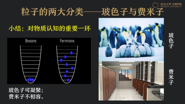 打个比方,玻色子就像一团企鹅,这就是凝聚态的形象;费米子就像男士洗手间,会有一定的距离感,这种距离感体现出费米子的泡利不相容概念。当然,这是一个有点味道的笑话。