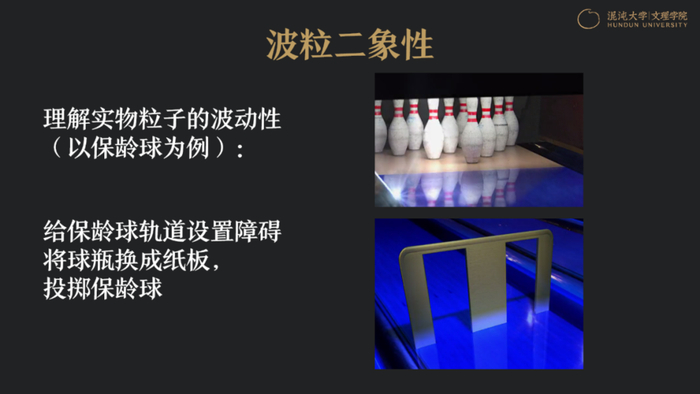 但是如果将保龄球换成是电子,将障碍设置为细、将纸板换成接收屏,我们会发现,最后在接收屏上的成像不是两个洞,而是一条又一条条纹状的成像。这就是量子描述的波动,波粒二象性,如果说保龄球是电子的保龄球,那么它也是波动性和粒子性并存。
