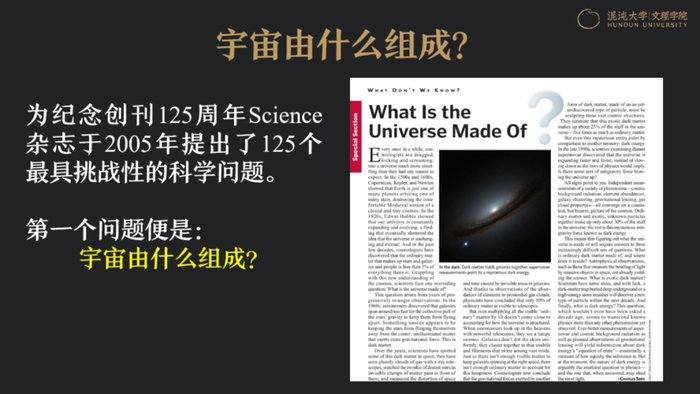 同时,国际上也在思考。2005年,联合国将其命名为世界物理奇迹年,这一年,Science期刊提出了125个当时他们认为最具挑战的科学问题。其中一个问题就回到了刚才屈原的追问,即我们的宇宙由什么组成?