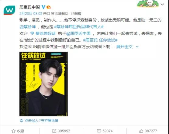 2月28日,屈臣氏中国官宣了明星蔡徐坤成为品牌代言人,消息发布一天后,该微博已经获得了将近40万的点赞与近6万的评论。可以说,这次官宣热度,几乎是全靠蔡徐坤粉丝撑起来的。
