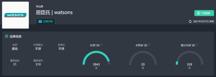 截至3月7日,屈臣氏已在全国31省份(含直辖市)的310座城市拥有门店3943家,另有20家未营业,累积闭店339家。