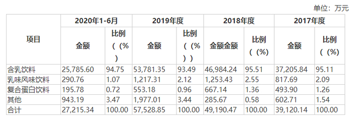 从收入构成上看,含乳饮料长期为李子园贡献了超过95%的营收。于2017年度、2018年度、2019年度和2020年1-6月,该公司含乳饮料营业收入分别为57,757.16万元、76,008.31万元、92,918.70万元和40,974.22万元,年均复合增长率12.37%。