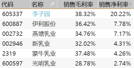 其实单看销售毛利率,李子园和其他同业(伊利、蒙牛、燕塘、新乳业、光明)差距不大,而销售净利率却存在明显差距。2021年3月8日,据wind显示,李子园与其他同业的销售毛利率基本在30%-40%之间;销售净利率方面,李子园能够达到20.22%,而其他同业均在10%以下,其中伊利为其中较高者,也仅为7.78%。