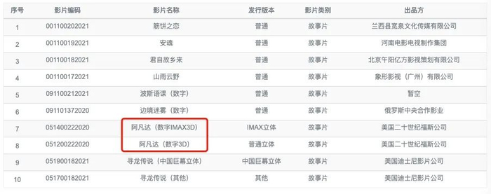 3月10日,澎湃新闻记者注意到,中国电影数据信息网显示,《阿凡达》的影片编码已出,且有数字3D和IMAX数字3D两种版本。这意味着,时隔11年,《阿凡达》要在中国大陆重映了。
