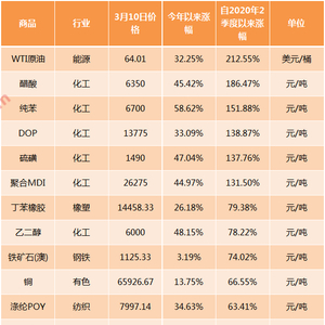 价格涨太快,以致于付款追不上涨价速度的情形,不止出现在钢铁行业。生意社数据显示,今年以来,57种主要的大宗商品中,30种商品涨幅超过10%,原油、聚合MDI、阔叶橡胶等11种商品涨幅超过30%,纯苯年内涨幅更是超过50%。