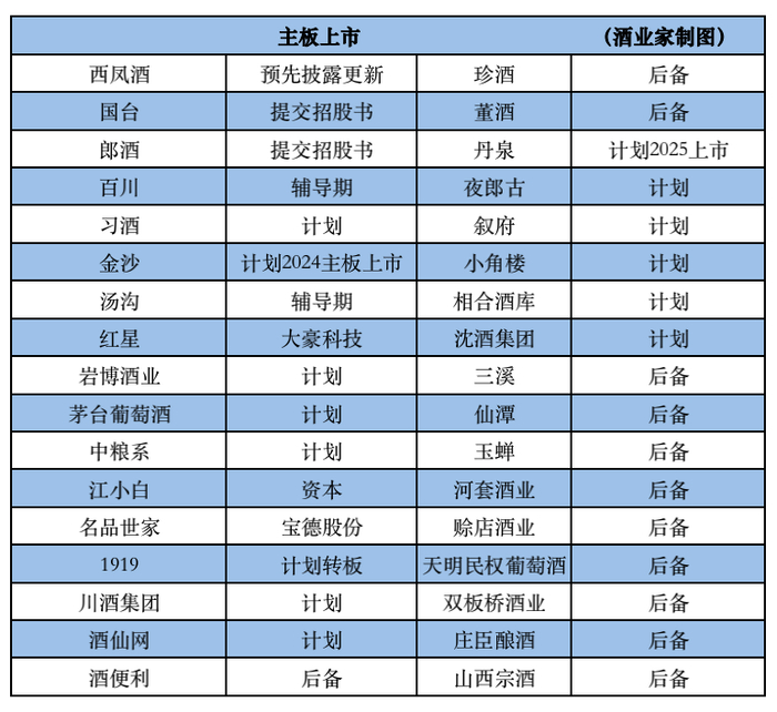 而透过以上这份上市名单,不难发现:闯关IPO前线的企业不乏名酒企业与渠道大商,西凤集团、国台酒业、郎酒股份、百川名品、红星、酒仙网等酒企。