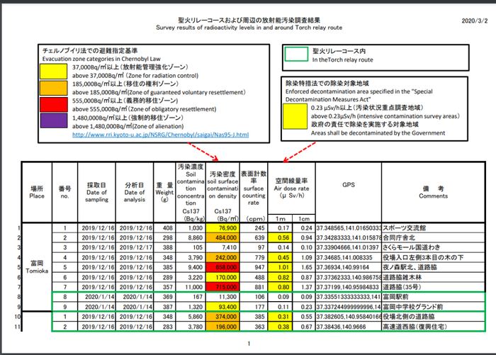 中村顺和志愿者一同发布的东京奥运圣火传递沿途辐射量报告。受访者供图