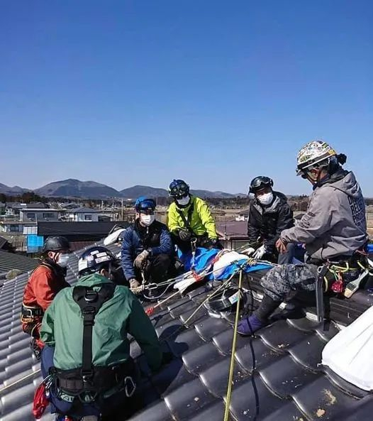 黑泽司(右一)3月6日在福岛县修理受损屋顶。受访者供图