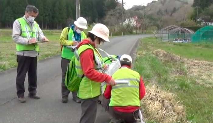 2014年4月“福一周边环境放射线监测项目”的成员在福岛南相马市测量住宅周围的土壤辐射量。受访者供图