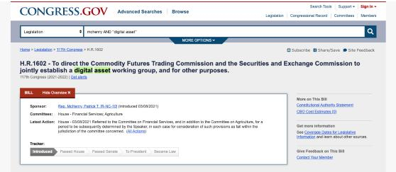 美国国会官网2021-2022第117届国会立法提案中,3月8日由众议院发起的HR1602提案《指导商品期货交易委员会(CFTC)和证券交易委员会(SEC)联合建立数字资产工作组以及讨论其他事项》引发加密行业关注。